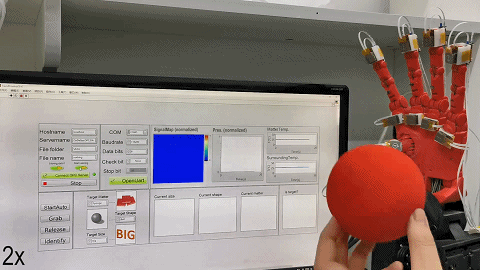 为了训练机器手的物体识别能力,该团队在室温下操作机器手,并分别让其抓住人手、以及其他大小和形状均不相同的材料,如钢球和海绵等。在机器手抓住这些物体时,该团队会记录下传感器的输出信号。