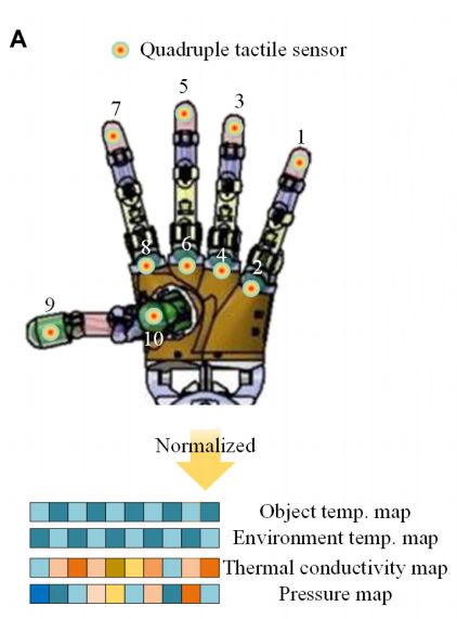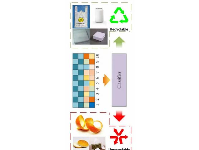 人手有能力通过皮肤中的热感受器和机械感受器,来识别不同大小、形状和材料的物体。基于此,朱荣团队提出了一种集成上述传感器的机器手,它能通过抓取来识别物体的大小、形状和材料,从而实现垃圾分类。