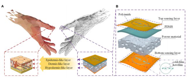 每个传感层上都有两个热敏传感元件,分别叫热膜和冷膜,它们沉积在柔性的聚酰亚胺基底上,上层传感层还覆盖着聚对二甲苯膜、来作为保护层。