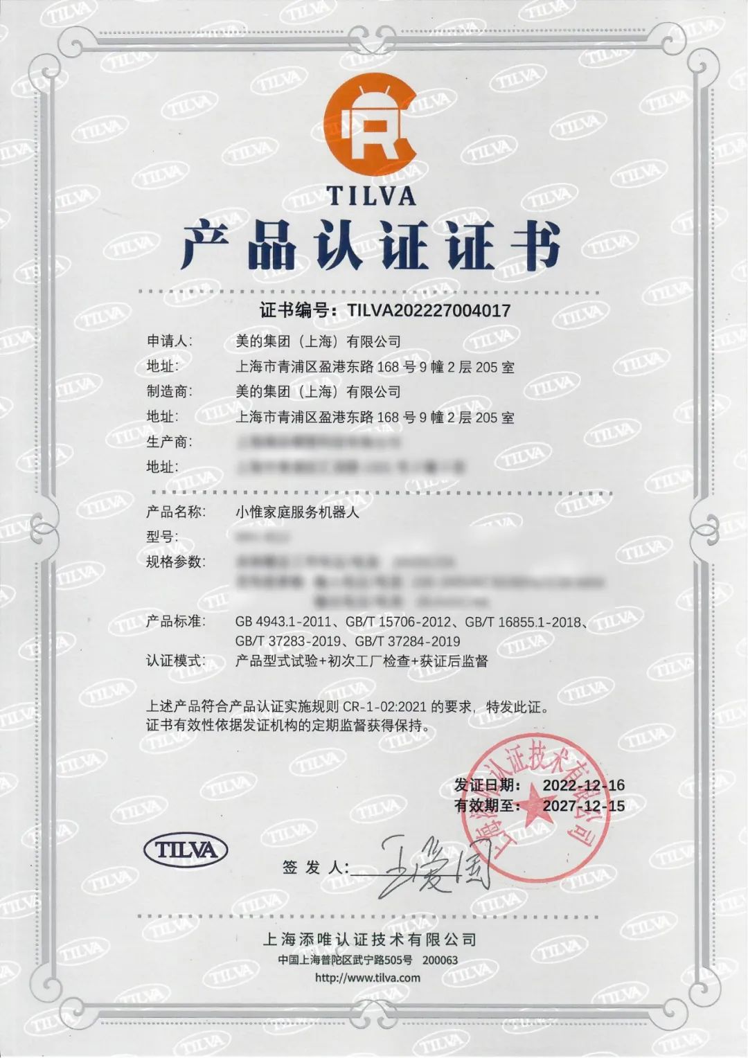近日,美的旗下wishug品牌首款产品小惟综合型家庭服务机器人,于国家机器人检测与评定中心(总部)顺利通过了产品专业测评,获得由TILVA颁发的中国机器人CR认证证书。此次获证标志着美的家庭服务机器人“小惟”在产品安全和电磁兼容性设计、生产质量保证能力和一致性控制方面达到国家机器人认证要求。