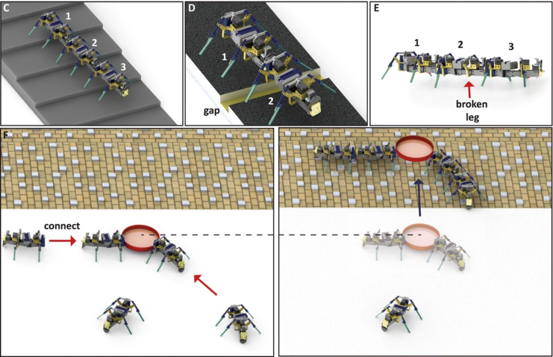 大家是否还记得下图的仿昆虫多节机器人?它的特点之一是可以自我重组,从而胜任多项由个体单元无法完成的任务。而在软体机器人领域,也有类似的例子,例如今天介绍的由介电驱动单元驱动的机器人。