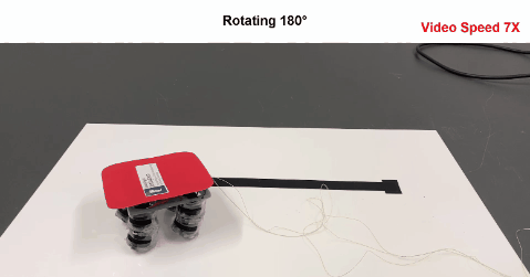 因此,研究人员将这种驱动器组装成软体机器人,通过控制驱动器(机器人腿)的电压时序信号,控制机器人分别实现的循迹前进(速度为2.1mm/s)和转弯运动: